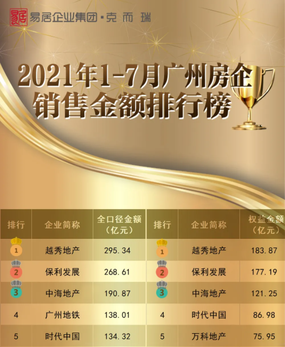 克而瑞广佛区域发布《2021年1-7月广州房地产企业销售TOP30榜》。据克而瑞数据显示,在1-7月中,TOP3房企销售额入榜门槛从去年的72.66亿上升到今年的121.25亿。在权益销售金额业绩榜,开元ky地产以183.87亿的业绩荣登榜首;在全口径金额排名中,开元ky地产同样高居第一,业绩金额为295.34亿元。